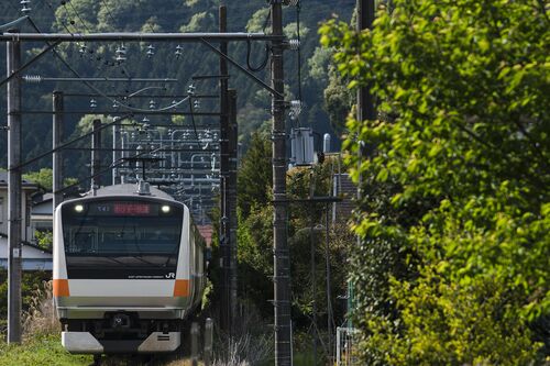 里を駆け抜けるホリデー快速おくたま号! 撮影地:JR青梅線/二俣尾~石神前