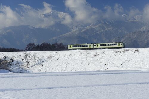 雪晴れの甲斐駒ケ岳をバックに走るキハ110を捉えました。 撮影地:JR小海線/小淵沢〜甲斐小泉